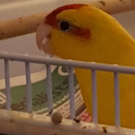 Yellow kakariki bird with red striped head and silver aluminium ring on leg female I just want her home went missing from holmer lake stirchley Telford