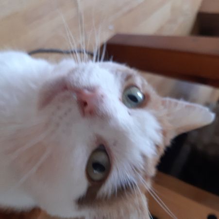 He has a patch of pale brown fur over one eye and a nick in one ear.