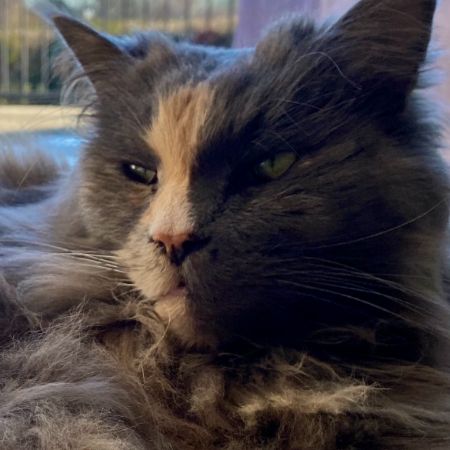Big grey fluffy Maine coon with distinctive ginger nose and ginger lower right jaw ( left side of face completely grey) . Deep v-notch at top of left ear. Timid cat that is unlikely to come to strangers.