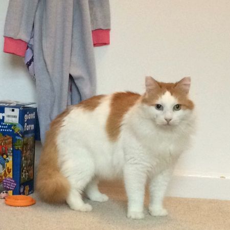 Dempcy is semi-long haired white with ginger markings on his face tail and body. He has different coloured eyes (blue and yellow). He is shy, but extremely kind-natured.