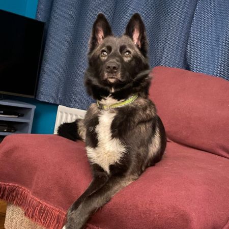 Black husky cross, with a white chest, white paws. Wearing a green collar, possibly still trailing a red lead.