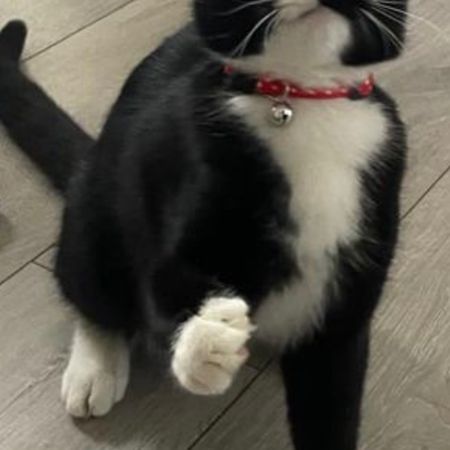 Black and white tuxedo cat with white marking on right side of nose (left to viewer). Has white mittens and boots. Was wearing a red collar with white dots and bell