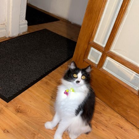 Black and white Long haired kitten, with black mark on her left paw, Ear tufts, wearing a yellow collar and pink dog bone tag