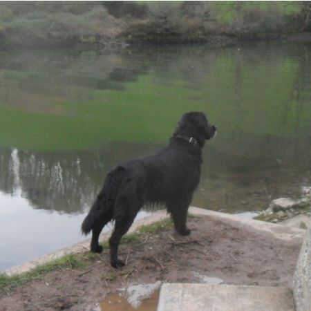 He is slightly larger and has a broader head compared with most flatcoated retrievers. He also has a very waggy tail.