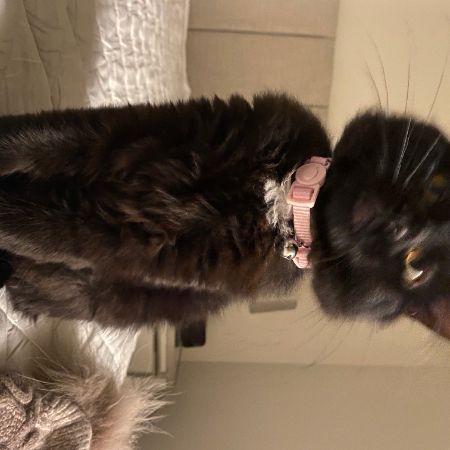 She’s a fluffy petite black cat with a white diamond on her chest and cute little tufts of hair underneath her ears.