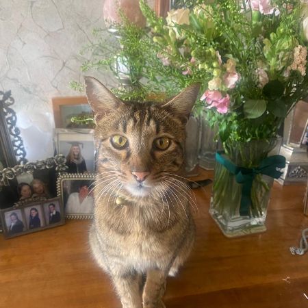 Our sweet male Savannah cat is slender with a yellow collar with a phone number on. He is brown tabby coloured, with some spots on his tummy. He has a white chin and a pink nose. He has a small indentation on one of his ears. He is quite friendly and curious.