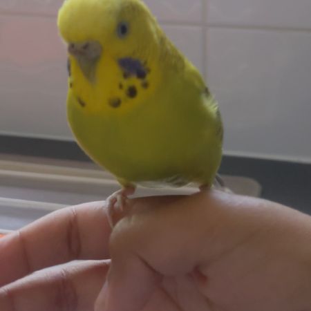 A green/ yellow budgie with a brown cere. It is tamed and would go on your finger as long as you try not to make your self a threat.