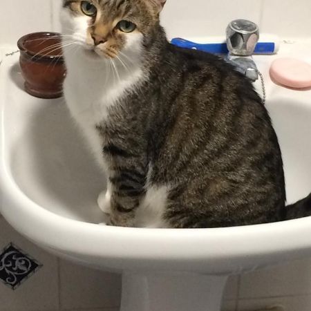 Cat's name is Coco. He is a British short-hair, tabby with a white tummy and paws. He is sweet and friendly but he can be shy around people he doesn't know. He likes biscuits and responds to tongue-clicking. He is not wearing a collar but he is microchipped.