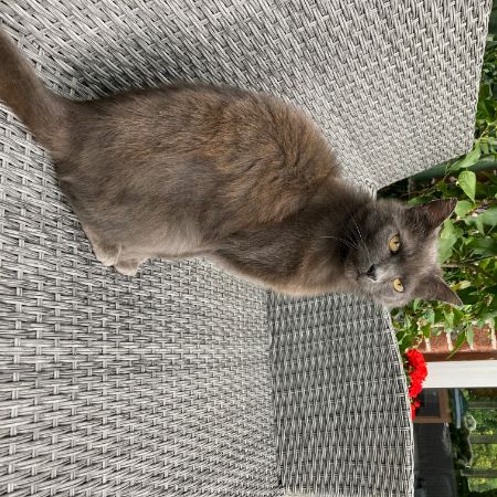 Felix is grey all over with pink pads on his paws. He has amber coloured eyes. He is a very gentle soul and will be very anxious away from home.