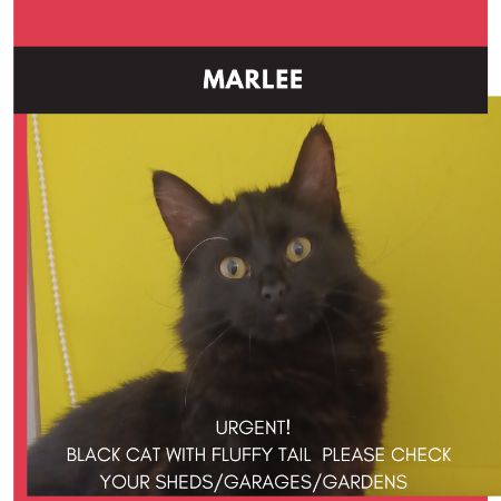 Black cat with a fluffy tail. May be pregnant.