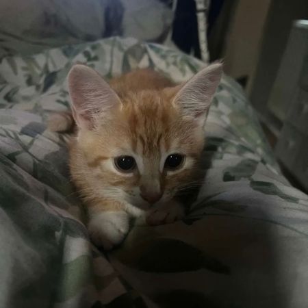 butter has orange swirl patterns on his back, green eyes, a flared looking nose, white fur around his eyes and his mouth and white paws. butter also has a a kind of raspy meow at times.