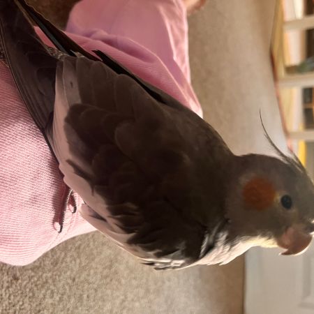 Pearl has a soft orange cheeks and a grey body with a tiny bit of yellow on her crown. She has some yellow under her tail also and has some white feathers also by her grey feathers . She likes seeds and comes if we call her name and if we play a male flock call