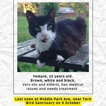 Old and skinny, weighs 1.9 kilo. Quite frail but friendly. She's under medication and is due another vet visit. She jumped out if my bedroom window and decided to go on an adventure. She's normally an indoor cat so completely out of character for her.
