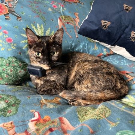 Tortoiseshell with stripy tail, petit and very timid . Will probably have no collar