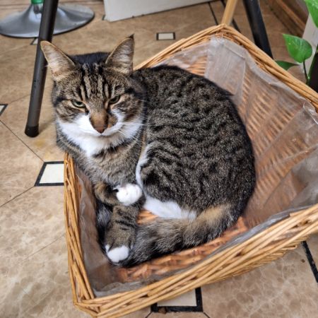 White paws and brown patch on left side of nose. Cautious of strangers but loves treats such as dreamies