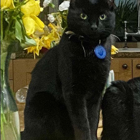Small white are on chest visible mainly when close, Black cat but also has odd white hair throughout coat. Small for a male cat. Very timid will only get close when trusts someone.
