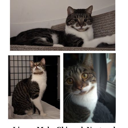 Brown tabby cat microchipped and neutered. His paws and tummy is white.