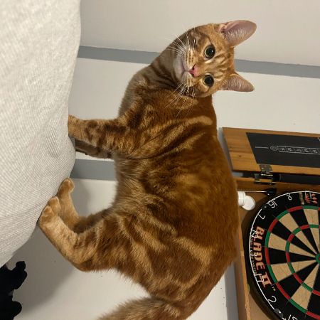 Rory is a Bengal X ginger cat. He’s very vocal and loving. He has big green eyes and is very vocal. His coat is dark ginger blended with light ginger stripes. He has a white tip of his tail.