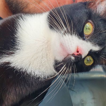 He is slim male, microchiped and neutered, and one of si front leg is shaved due to recent anaesthesia. His nose is half white half black and paws white.