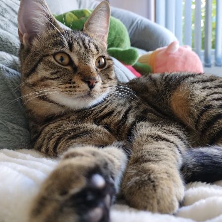 Very distinctive grey and brown Tabby with half Bengal markings, quite timid but very curious.