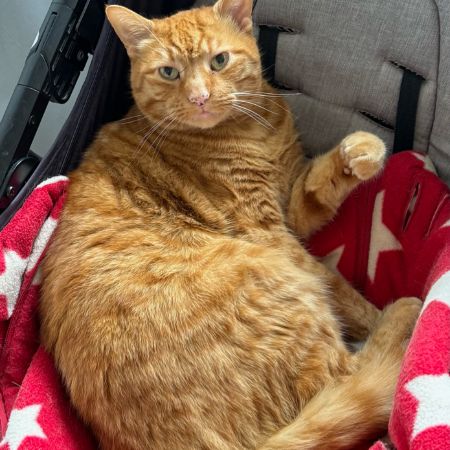 Totally ginger. No white markings. Black freckles on nose. One snaggle fang tooth longer than the other.