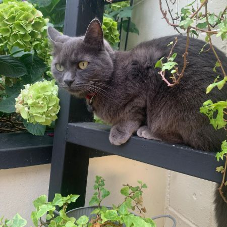 Benji or Benji Bum. Responds to his name. He is really chatty. He is a beautiful grey cat with a shiny sleek cost. He gets taken as a blue but he is a domestic cat. He is quite small cat, 3.5kg and when he jumps he lands with a loud thud. He is very homely so doesn’t go far