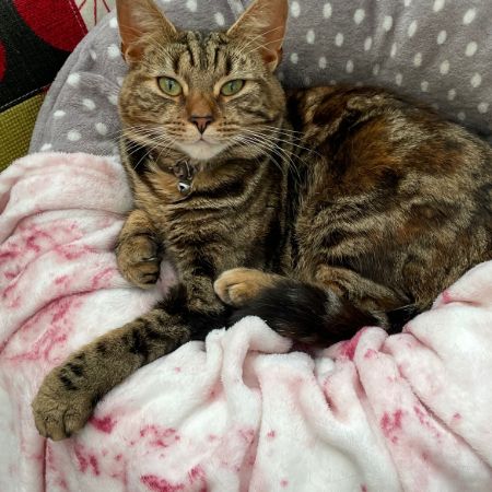 Coco is a tortoise shell (tabby) brown with a mix of brown, Black and Tan fur. She has distinct tabby markings (stripes & swirls), a lighter coloured chest (fawn) and a n almost white muzzle. She has greenish eyes. She is very petite for her age and very timid.