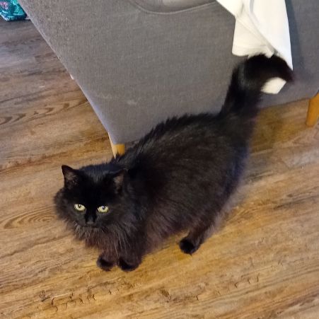 Daisy is a black domestic longhaired cat. There are some gingery bits around the chest area. She is quite a nervous/timid girl.