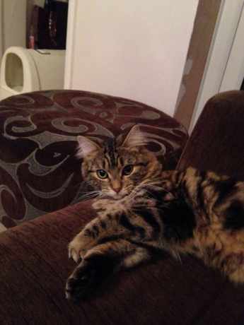 She is very clever but cautious, she doesnt go to strangers. She has normal tabby stripes but a busy tail and fluffy ears... very sweet face and so loving. She never strays far and always stays in at night