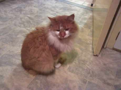 he longed haired fluffy ginger and white mainly ginger ginger spot on his right side he dont like strangers meduim size
