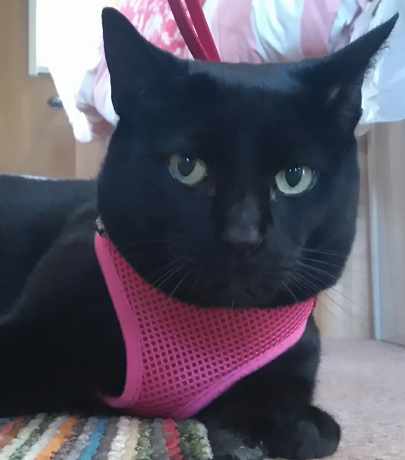 Blackie was a rescue cat, we only had her a week but she got frightened by another cat we think and jumped out of a window which we thought was secured. She is mainly a house cat we were told. She is microchipped and we were told she is neutered. She is quite timid, vocal and sometimes a little grumpy!. Loves her food which is why the vet advised us to put Blackie on a diet as previously owners were feeding her popcorn. She was wearing a purple fabric collar with purple flower and horseshoe shaped charm and Bell attached.