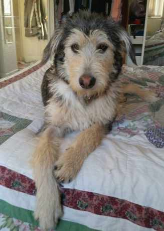 Large spinner X Griffon. Very unusual looking dog grey/black and light tan/sand. Black nose with pink patch. Very friendly