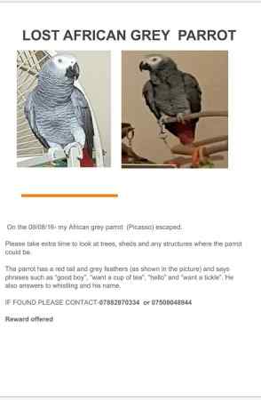 Report your missing bird on our Bird Registers for free and we will do a pet match to display any birds which match in the area. You can also create and print your lost bird poster. Report a missing bird here