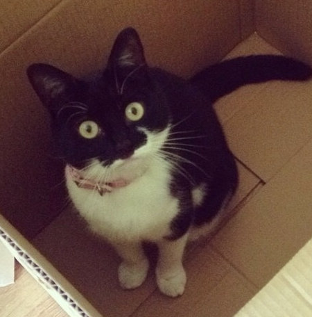 AT THE TIME SHE WAS WEARING A BLUE DIAMANTE COLLAR. SHE IS HALF BLACK HALF WHITE, THE WHOLE BOTTOM PART AND HER CHIN IS WHITE AND HER TALE IS BLACK.