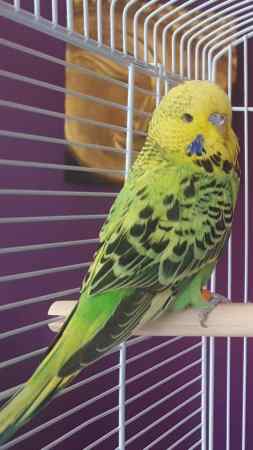 Young green budgie with yellow head feathers. Feathers are longer than normal budgies. Blackish pattern over wings top of chest and head. Quite a chatty bird. Blue cheek feathers on either side. Small orange ring on right foot