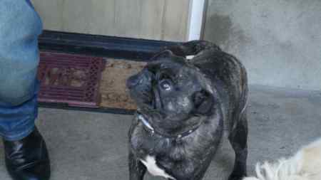 He is a cross with Pug and French Bulldog, With his ears down he looks more like a pug. He is brindle short prickly hair