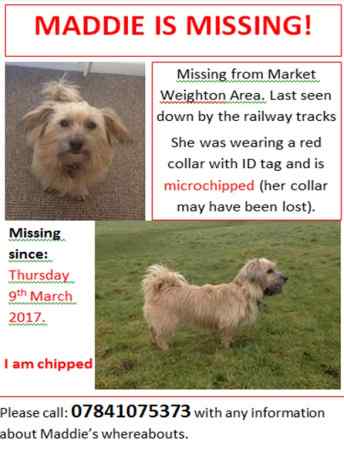 This lost Terrier Dog was last seen around Market Weighton East Yorkshire