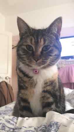 She's a 9 month old small tabby cat. She was wearing a cobalt blue collar was a bell. She has a fluffy tummy and her eyes are quite slanted. Really loved and missed
