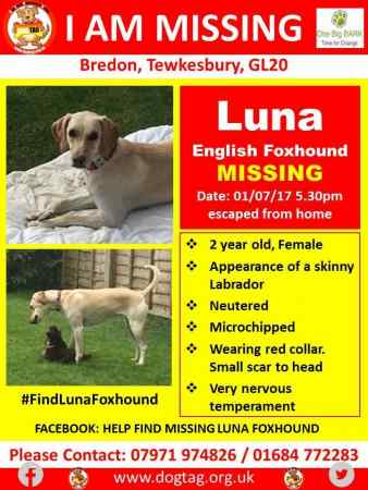 Missing 1/7/17 from GL20 7QG Bredon, Tewkesbury. Escaped from house. Rescue dog from Ireland, very nervous & dislikes men.
