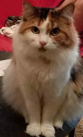 Multi coloured cat. With white underneath and ginger and black top.Afraid of strangers. Her name Jusy. Got long tail and very fluffy.Wearing a black collar with tag and bell.
