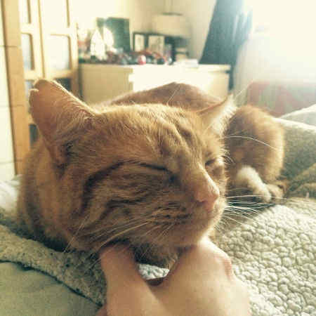 Fully ginger except for white tip of tail. Few nicks out of ear from when younger. Big eyes and long whiskers