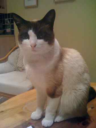 Cat is actually a snoeshoe which is part of the siamese family. generally a home cat who goes out to do her business.