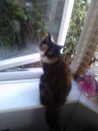 long haired tortoiseshell with one side of nose black and the other pale brown. Lovely big yellow eyes