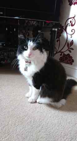 Tuxedo marked black and white, has a sliver of white on his black marked back and black rim around eyes even with white fur on one side. Pretty big, quite fluffy with medium long-ish fur. Wary of new people but curious, very jumpy and is alert to noises.