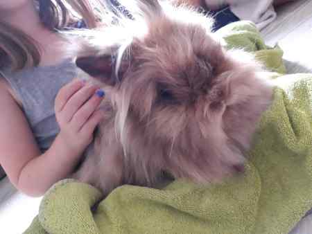 Double lion head rabbit so extremely fluffy with a short haired back.