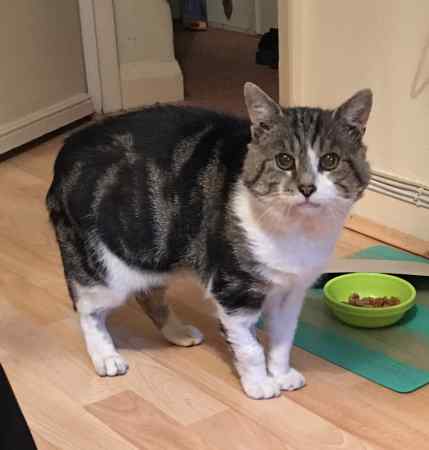 Muffin is a large male cat, with a lean muscular body. He has a large head, beautiful eyes, very big cheeks and a cute little mouth. He has very long legs, also long thin tail. Short-haired, his coat is mostly marble (mixed brown/ black/ grey/ white). Chest and legs mostly white. He shows slightly spotty skin below ears and on temples, where his fur isn't too thick. He's very considerate in character and will only do what's approved. He takes his food with his teeth rather than lips (reluctant to take food off your hand as he won't want to hurt you), shaking his head while eating.. He's been with me for the past year and I was about to get him micro chipped,. Muff is a very sweet happy cat