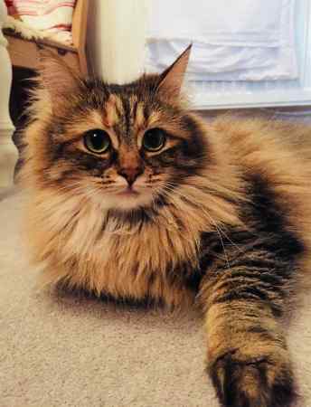 She is a very pretty long haired cat with tabby markings on her legs. She has a bib of fur around her neck and has a fluffy tail.