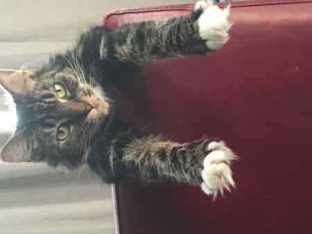 Female cat, may be skittish as have moved a lot the last couple of months. She has a funny meow which gurgles in her throat. Her name is Link but answers to Chuppet and is quite small.