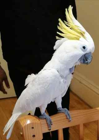 It's a greater sulphur crested cockatoo, larger than average cockatoo, will say hello and go to anyone, prefers walking than flying, strokable, has no feathers around his kneck has yellow feather pointing out on his head like a small cockatoo.