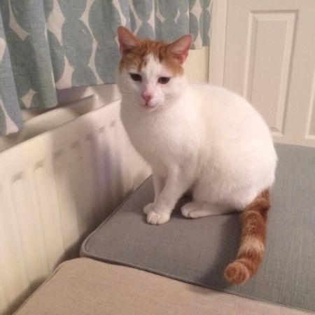 The cat is quite distinctive White body with small ginger patch on back right, ginger tail, white & ginger head